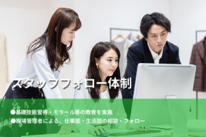 | 待遇 | 交通費支給(社内規定有) 社会保険完備 有給休暇付与(6か月経過後) 仮払い制度(社内規定有) |