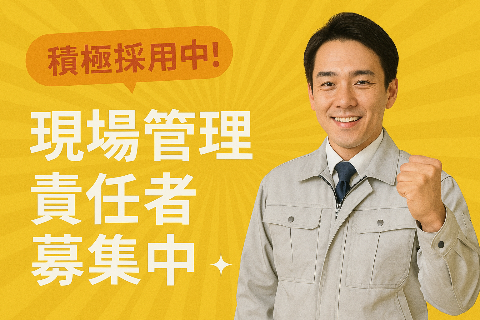 | 職種・内容 | 現場管理責任者 <募集形態> 正社員 <業務内容> 現場スタッフの管理 元方さんとの打合せ 他 |